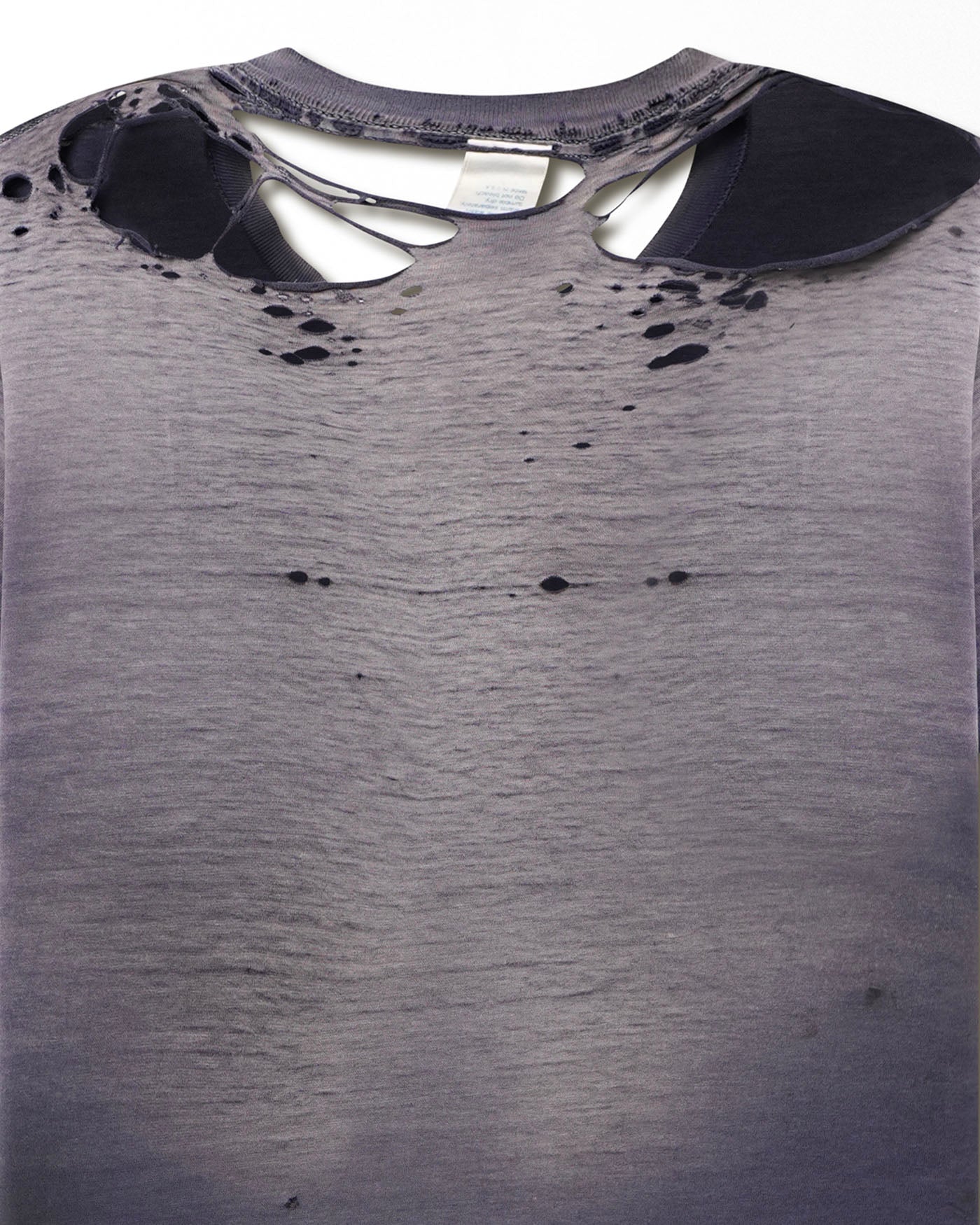 EN: Towncraft purple faded t-shirt with front pocket and single stitch. Features heavy signs of wear, large holes on the back of the collar, and scattered stains.